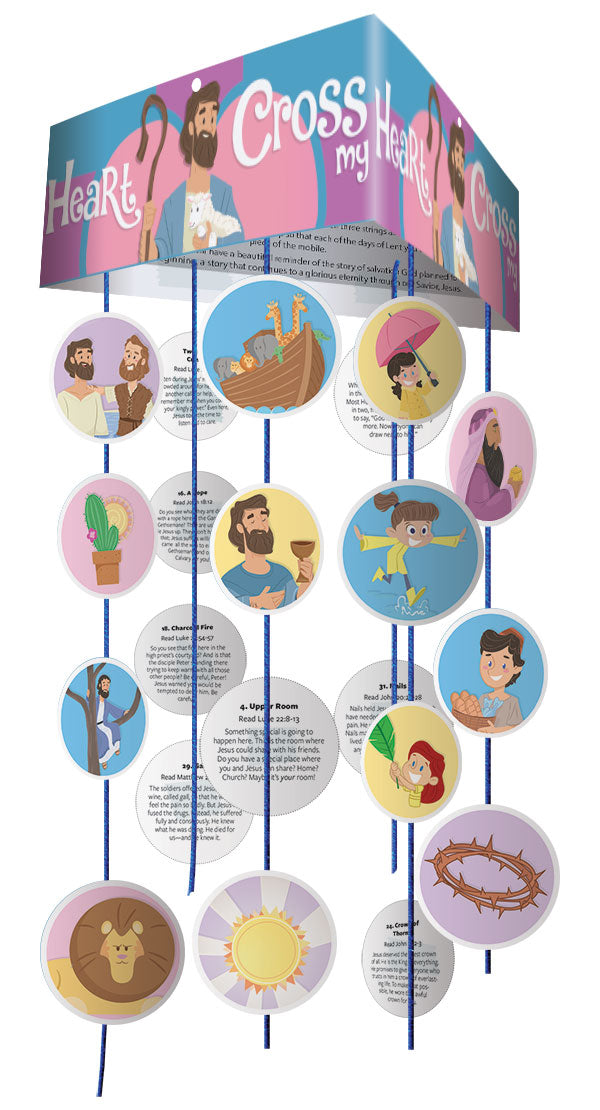 Perfect as a centerpiece above the table or in the classroom, family room or bedroom, this mobile grows throughout Lent as we pray through the days until Jesus’ glorious resurrection. Each day, a new piece is added to the mobile, creating a beautiful decoration for Easter. A daily devotional verse and Scripture passage are also included. A great companion piece to the children’s Lenten devotional booklet of the same name. Cutting is required. String not included. Great for Ages 5-10.