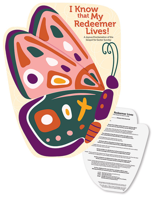 I Know that My Redeemer Lives is a picture a sea of happy butterflies raised in happy Easter celebration by every member of your congregation. I Know that My Redeemer Lives cutout is a colorful die-cut butterfly with an entire Easter sunrise litany printed on the back. Verses of the title hymn are interspersed with Scripture verses and prayers ideal for a sunrise celebration. Perfect for groups welcoming the Son outside!