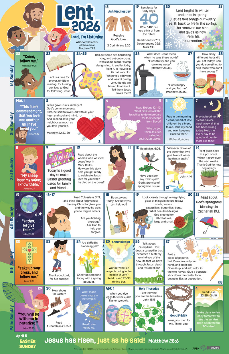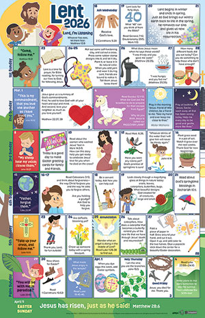This colorfully illustrated and spiritually enriching single-page Lent calendar is filled with prayers, thought-starters, activities and many suggestions for Bible reading. A step-by-step guide through the season of Lent is featured prominently among these mini meditations. Dated material not returnable.