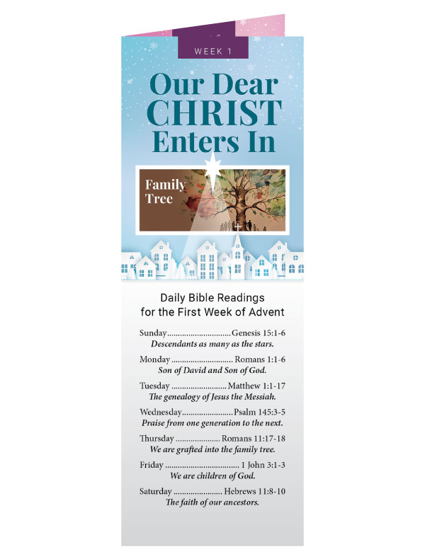 This bookmark of daily Bible readings for the four weeks of Advent follows the themes of Our Dear Christ Enters In: Family Tree, Home Hurts, Baby Names, Company Comes.